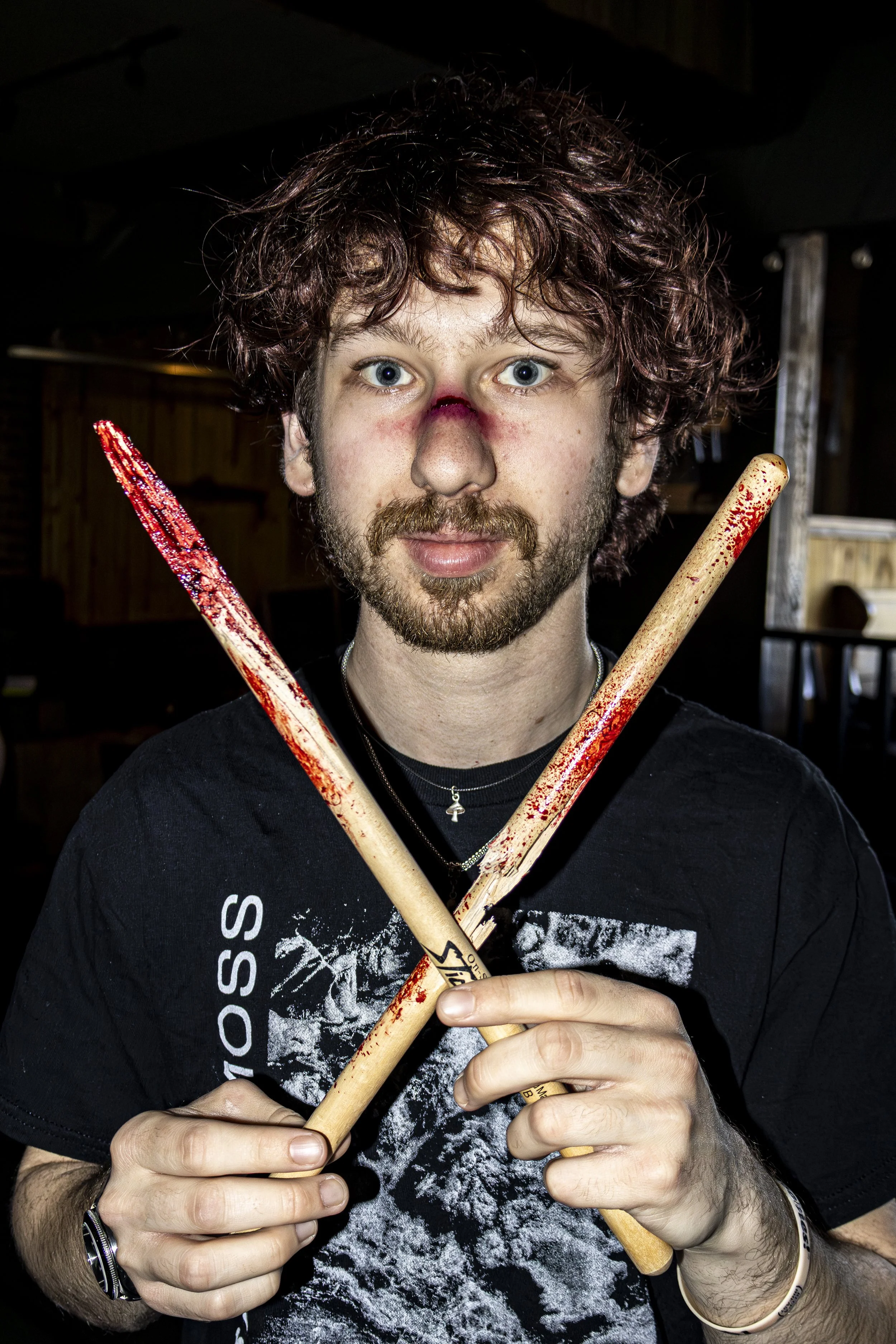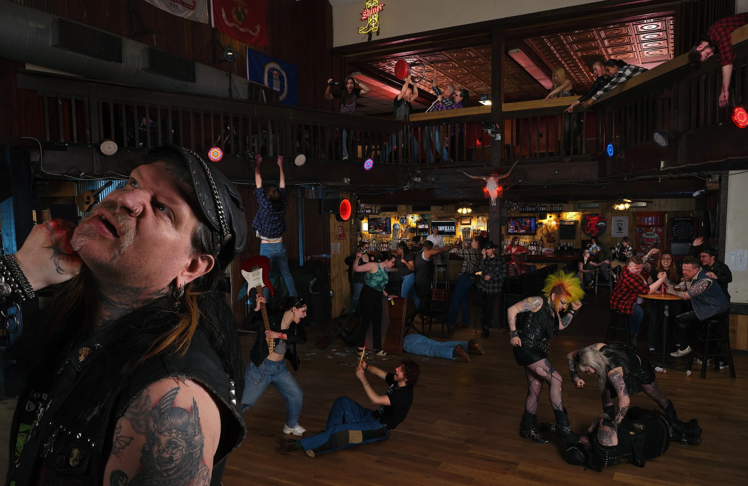 Fists fly, metal stools crash, and bodies hit the floor as a full-blown brawl consumes the bar. A mohawked fighter stomps her opponent while her partner pummels another with brutal precision. A Drummer blocks blows with his drum sticks, a biker swings a stool like a weapon, and someone films it all with eerie calm. A waitress slips, grinning cougar watching with satisfaction, while regulars arm-wrestle like the outcome controls the storm. The bartender stays cool, unfazed. It's not just a fight—it's a masterpiece of glorious, unfiltered violence.